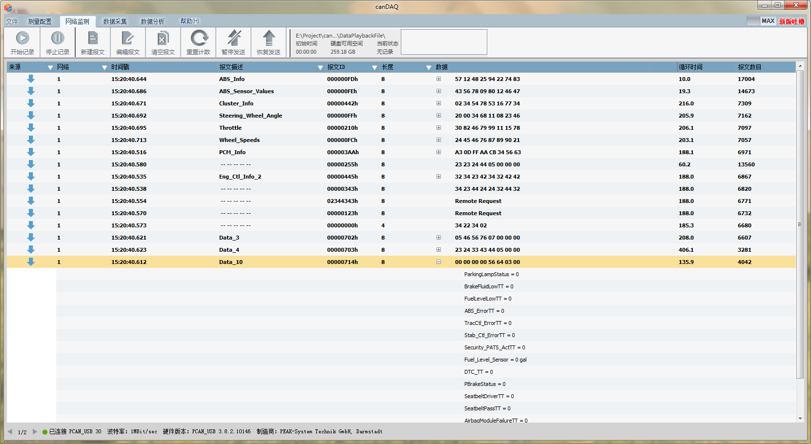 - 记录总线上传输的报文,包括时间戳、类型、ID、长度、和数据字节等