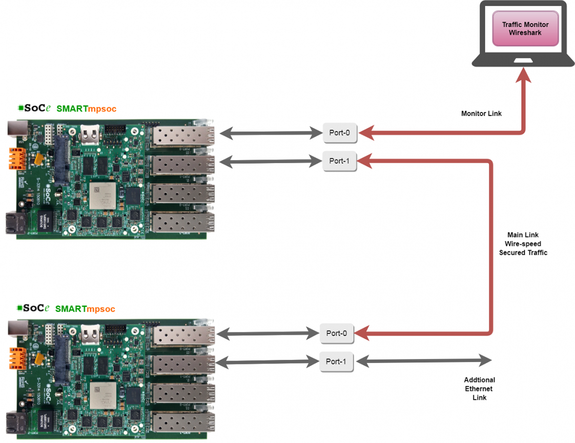 该套件由两块SMARTmpsoc bricks组成,如下图所示。这两块板卡均通过1 GbE以太网链路链接,该链路使用安全和非安全流量进行通信。附加的以太网链路用于监视以太网流量并集成其他设备,例如外部流量生成器。 |