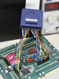 AT-LA500 provides a dedicated expansion bus, called AT-XSS, for expandability and synchronization with external instruments (i.e. oscilloscopes). The synchronization is bidirectional so that the oscilloscope and the logic analyzer can be in turn the trigger master.