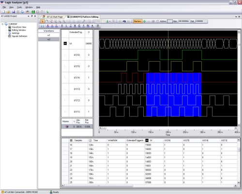 AT-LA500 can be configured to work as a powerful pattern generator-sampler. In this working mode AT-LA500 provides the capability to emulate standard serial or parallel bus transactions or custom digital interfaces for system or device debugging and characterization.