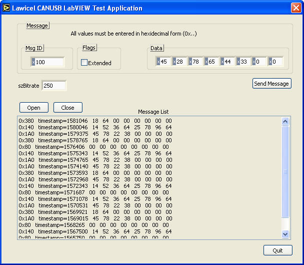 LabView 8 sample program (kindly provided by Nick Manor from EMP R&D Center) is provided as is, we cannot give support on it as it is right now, nor can the author. The program comes with source code and a stand alone EXE file, but in order to run the stand alone file without LabView 8, you need to download the runtime files from National Instruments FTP site. Also make sure you have installed the latest version of the CANUSB API DLL and the D2XX USB drivers.