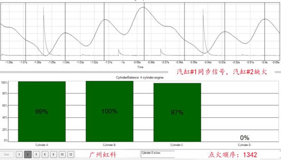 但究竟是哪个汽缸有问题呢?暂时不能决定。因为此时只是监测蓄电池两极的电压波动,PicoDiagnostics软件无法识别汽缸。通常PicoDiagnostics软件会把结果最好的条形柱放在最左边,然后按点火顺序向右逐一排列。