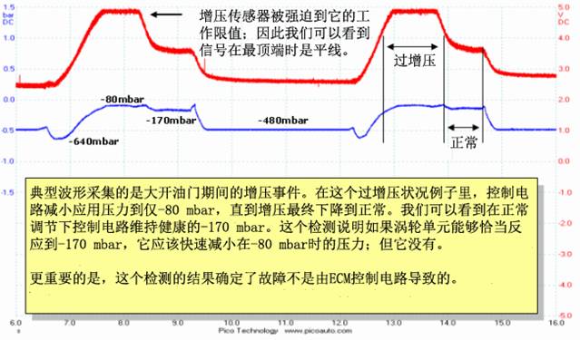 执行这个检测总是有点困难,要一只眼盯着实时的增压,另一只眼盯着真空表,另外要一个同事来开车。噢,且没有故障事件的记录。这里我发现WPS500X压力传感器让过程更简单。在路试前接上WPS500X压力传感器并设置Pico汽车示波器记录数据是非常简单、快速,且能提供一个与增压控制即时相关的原因及影响的记录。