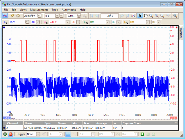 上方波形(红色):凸轮轴传感器(CPS) ;下方波形(蓝色):曲轴传感器(CKP)
