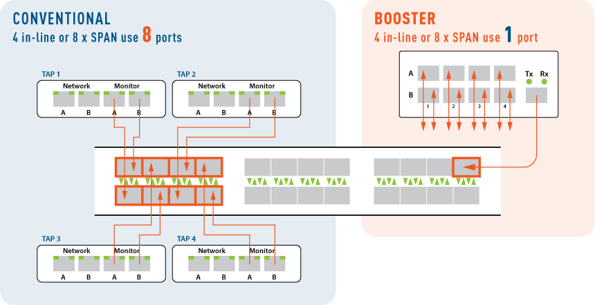增强器传输数据流从最多8端口(4路在线连接或8 SPAN 端口)到单个 NPB 端口,不同于常规需要的8路。通过优化你的网络数据包代理器上所用端口的数量。该增强器带来从未有过的节省和超高的投资回报率。